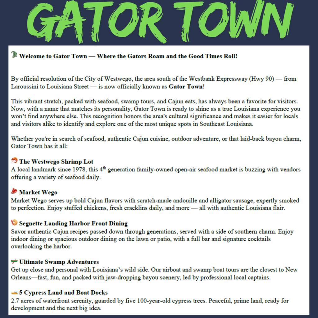 Gator Town is located in Westwego just off the hustle and bustle of the Westbank Expressway! Gator Town features Ultimate Swamp Tour Adventures, Segnette Landing Restaurant, an oyster packing company and the beloved Westwego Shrimp Lot, a seafood market with daily fresh catch!