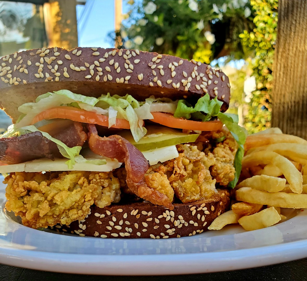 Oyster Club – A hearty sandwich stacked with fried oysters, bacon, lettuce, tomato, Swiss cheese, and mayo on 9-grain bread, served with golden fries.