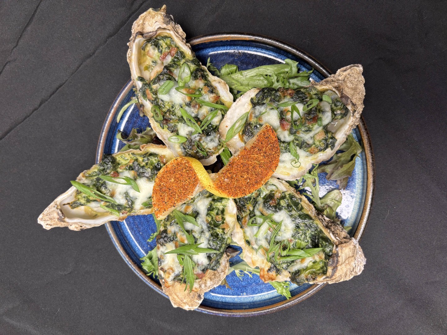 Half shell oyster stuffed with Andouille and Creamed Spinach