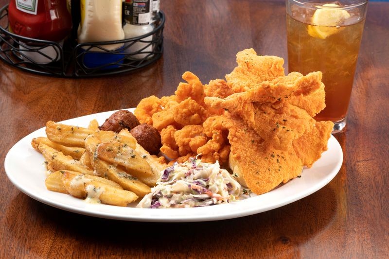 Enjoy our famous thin-fried catfish, whole meal salads, gourmet half pound burgers, or a taste of New Orleans with items such as fried shrimp, oysters (charbroiled too), and overstuffed poboys.