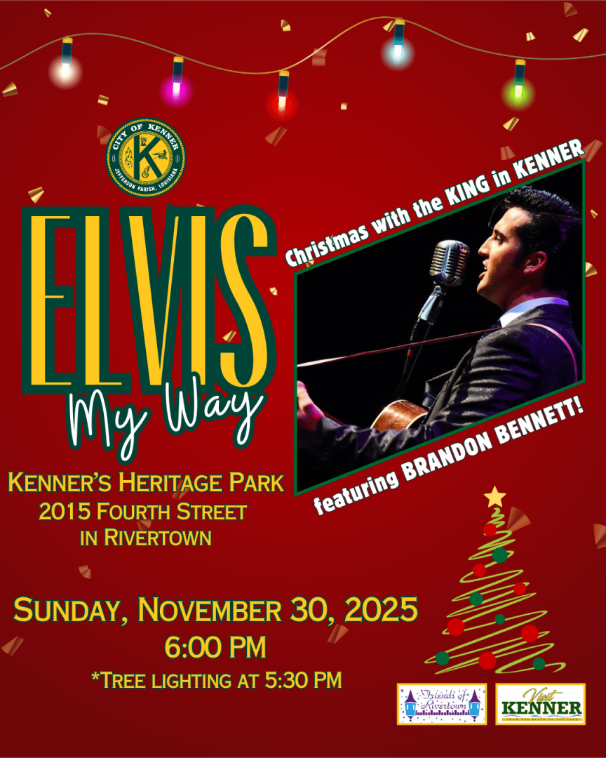 It’s time to rock around the Christmas tree, Kenner! Join us for Kenner Christmas Village Opening Night featuring the electrifying “Elvis My Way” with Brandon Bennett, a holiday performance you won’t forget!