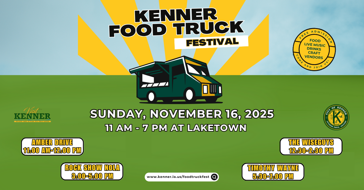 The City of Kenner's 4th Annual Food Truck Festival is Sunday, November 16, 2025, at Kenner's Laketown (by the Kenner Boat launch) from 11:00 AM - 7:00 PM. Admission is free. Live musical performances by Amber Drive, The Wiseguys, Rock Show Nola, and Timothy Wayne. Experience Arts & craft vendors, a kids' activity zone, and the delicious cuisine of over 30 local food trucks! Stay tuned for more updates.