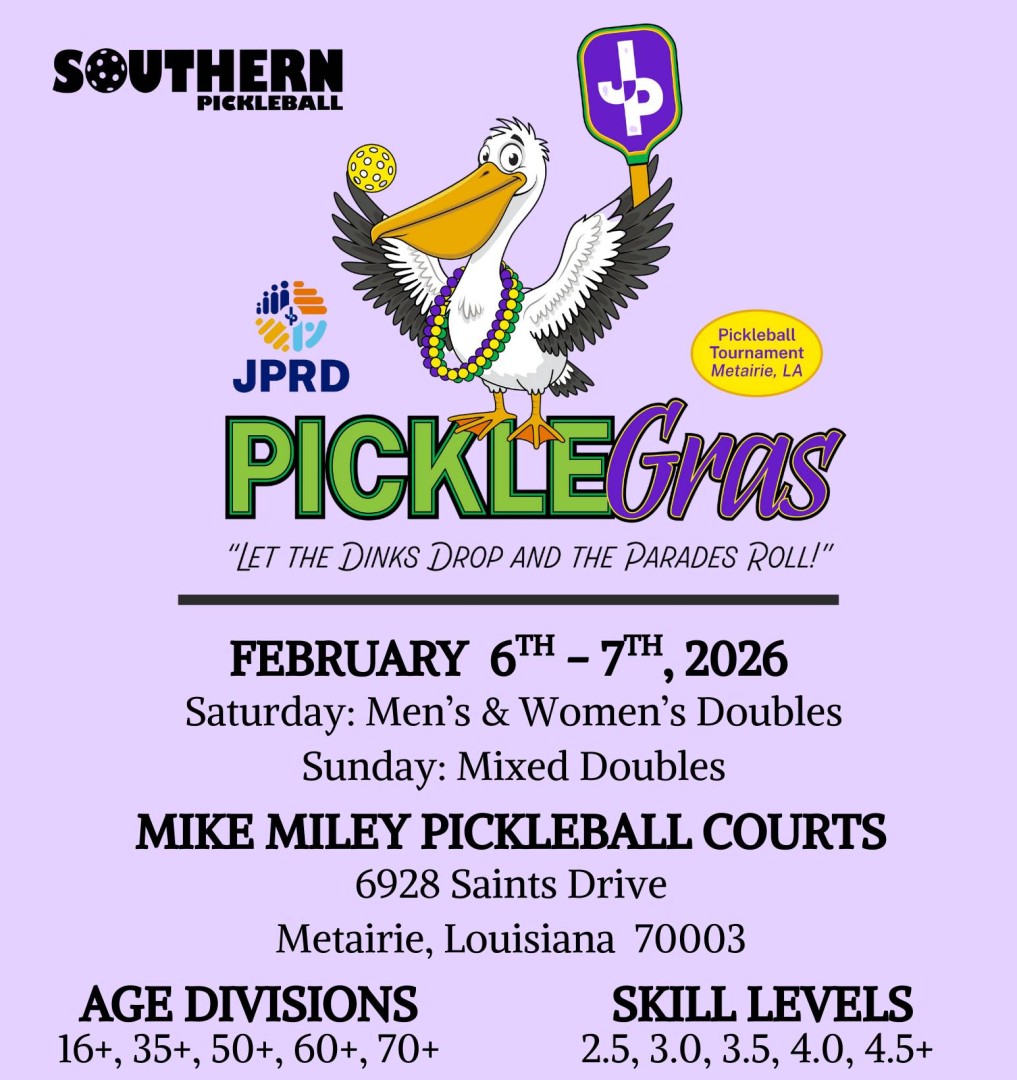 Welcome to the 2026 Pickle Gras Tournament. This tournament is played at Mike Miley Pickleball Courts in Metairie, LA! Southern Pickleball will be making its first stop in Metairie for a weekend full of exciting pickleball, good times and community during the weekend of FAMILY GRAS IN JEFFERSON PARISH!