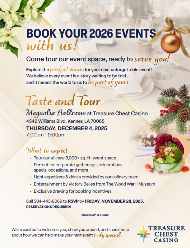 Taste and Tour the Magnolia Ballroom at the Treasure Chest Casino4540 Williams Blvd