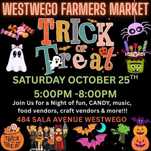 The Westwego Farmers Market is excited to host the 5th Annual Trick or Treat event at the Westwego Fisheries & Farmers Market!