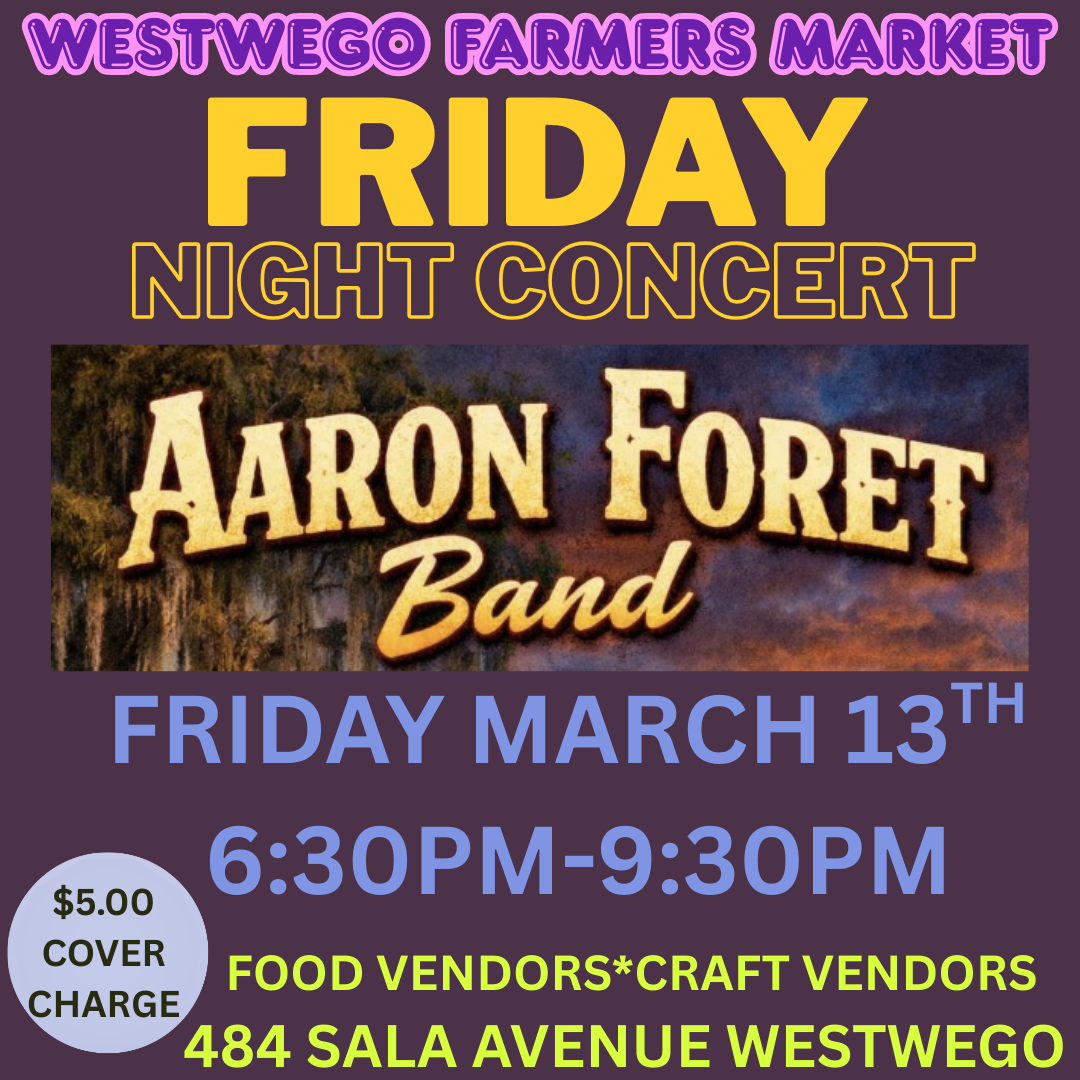 Come join us for our Friday Night Concert at the Westwego Fisheries & Farmers Market we will have live music from the Aaron Foret Band from 6:30pm-9:30pm. There will be food and craft vendors & more